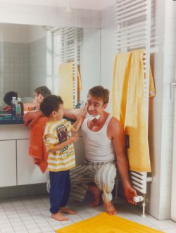 bekleidet beim Zähneputzen oder Rasieren vor dem Spiegel steht.