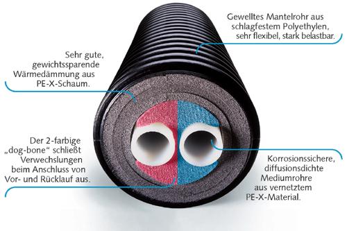 Die flexiblen, vorgedämmten Ecoflex Erdleitungen erlauben die Realisierung individueller Installationslösungen. Der Aufbau nach dem "Zwiebel-Prinzip" bietet mehrere Vorteile: Das gewellte Mantelrohr aus schlagfestem Polyethylen schützt die innen liegenden Lei-tungen gegen äußere Einflüsse. Als Isolierung dient weicher, gewichtssparender PE-X-Schaum. Er schützt die korrosionssicheren und diffusionsdichten Mediumrohre aus vernetztem PE-X-Material. "Markenzeichen" aller Ecoflex Thermo-Twin-Rohre von Polytherm ist der zweifarbige "dog-bone", der Verwechslungen beim Anschluss von Vor- und Rücklauf ausschließt. Foto: Polytherm